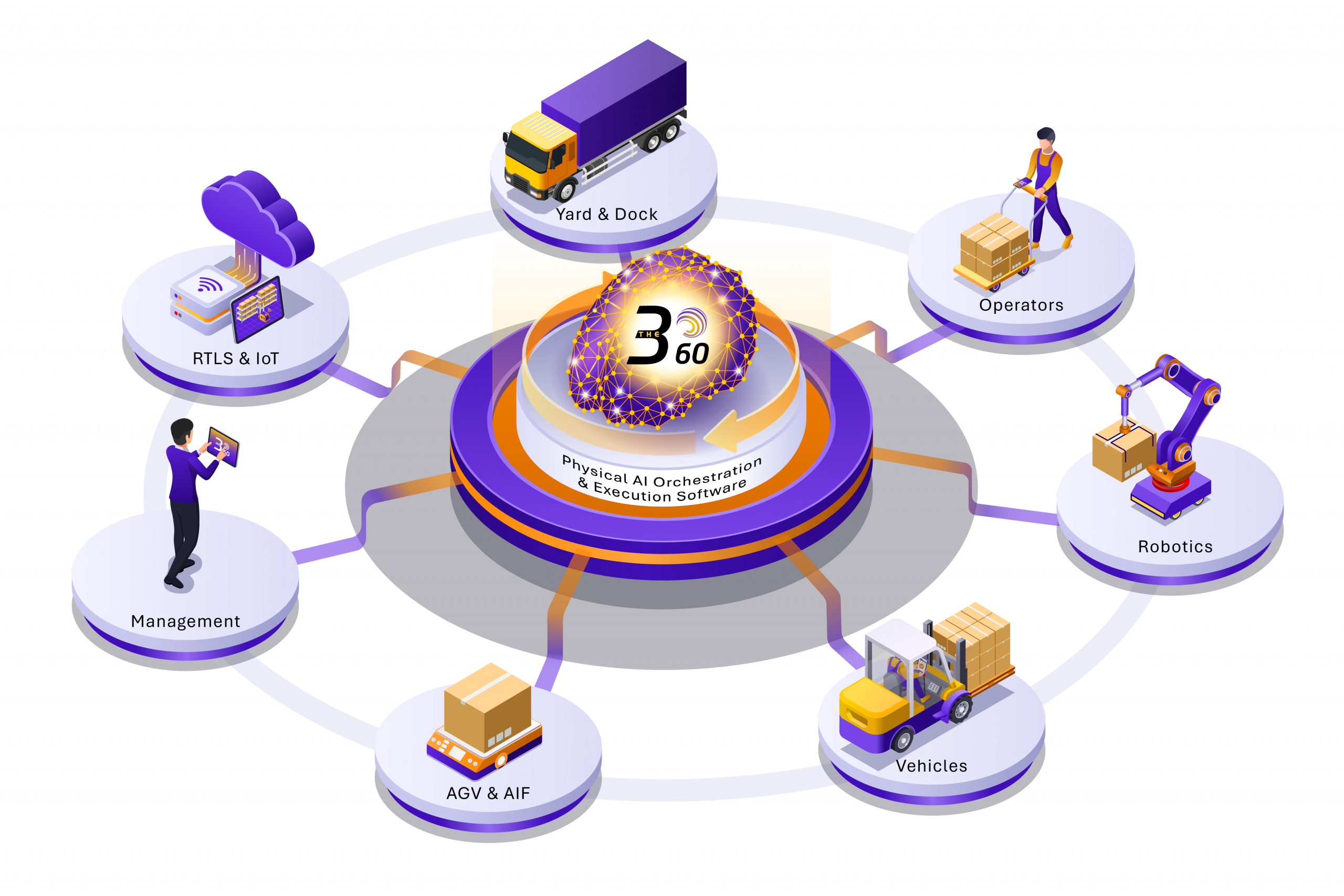 A central intelligent brain that orchestrates operations and controls real-world sensors using in-motion data to push synchronized tasks to physical resources (humans, forklifts, AMRs, AGVs, robots, and other automation), fully automatic.